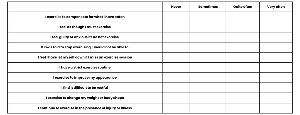 If you find yourself selecting 'quite often' or 'very often' for multiple statements in this table, it can indicate that your relationship and engagement with exercise could be unhealthy for you, and likely having a negative impact on your physical and mental health.